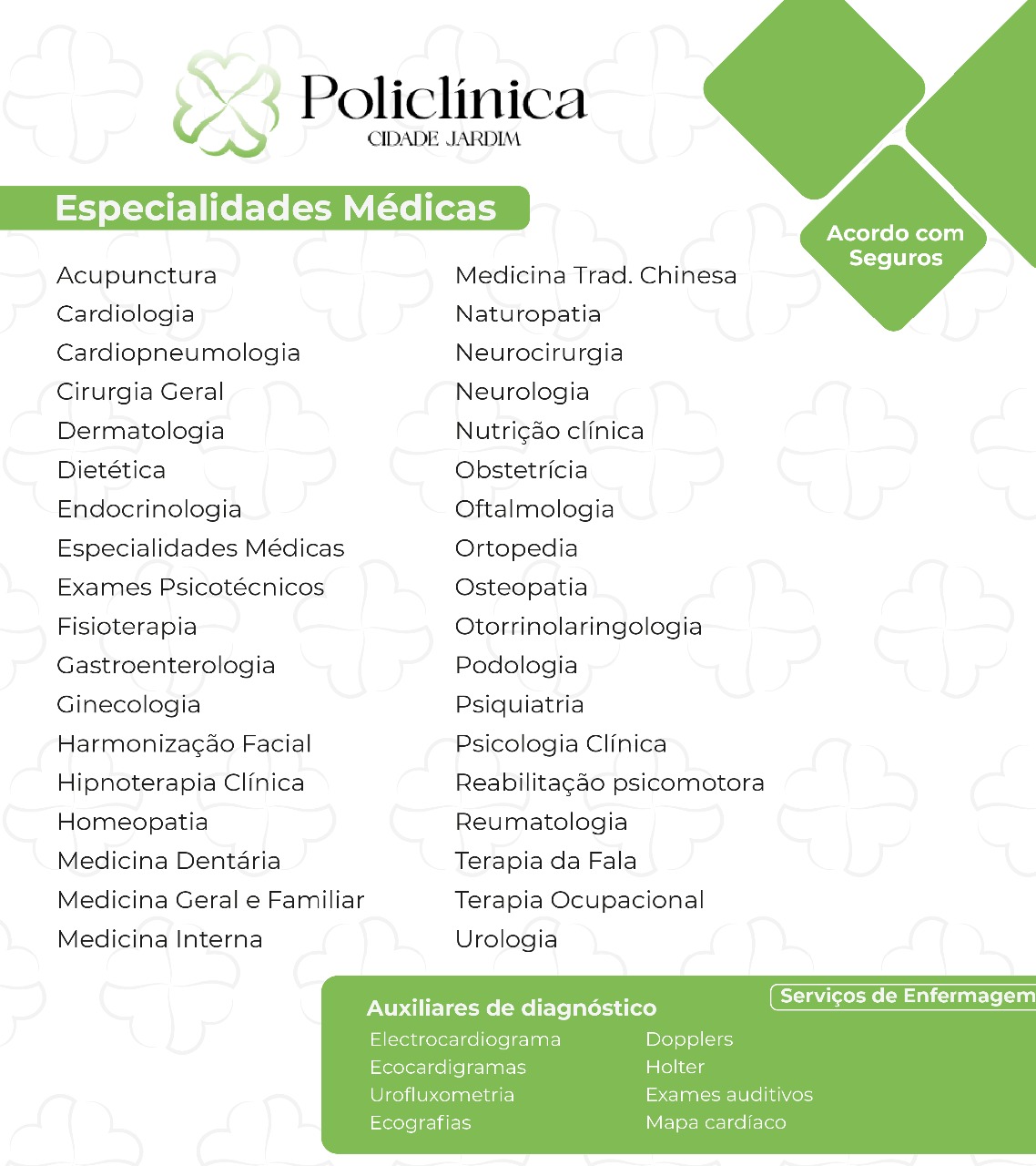 Contamos com diversas especialidades médicas e serviços de diagnóstico, atuamos com foco na prevenção, diagnóstico e tratamento, sempre respeitando as necessidades individuais de cada paciente.